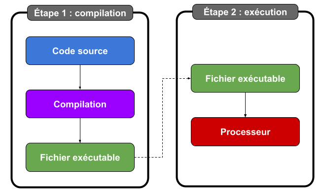 Avec les programmes compilés, l'exécution se fait en deux étapes :